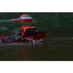 Zdalnie sterowana, napędzana bezszczotkowym silnikiem elektrycznym łódka motorowa SNIG Rescue Boat Turbojet 2,4GHz firmy Heng Long - wersja kolorystyczna czerwono-czarna.