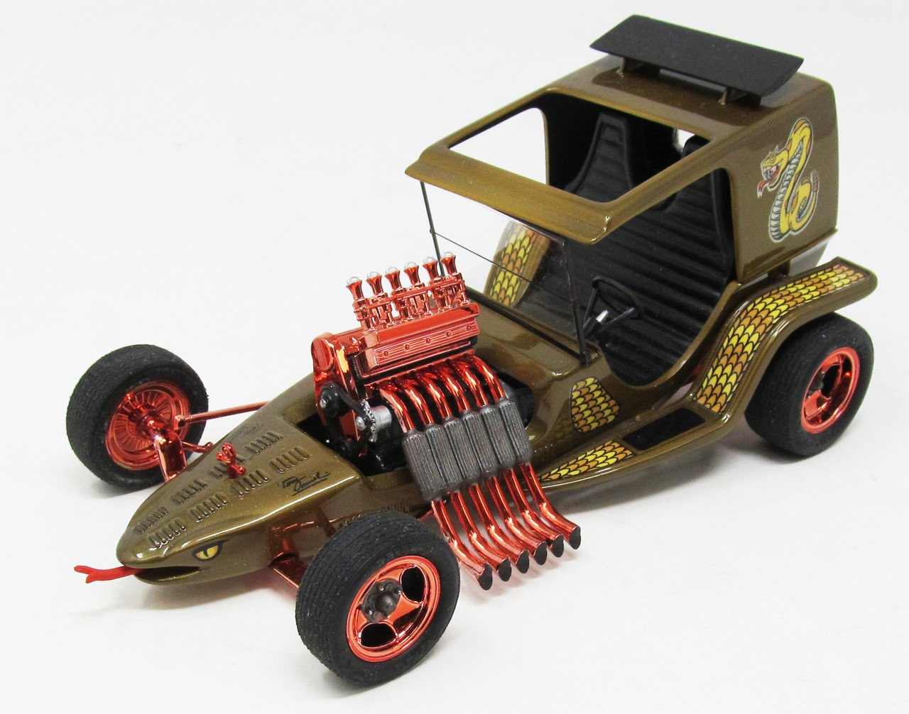 Skala 1/24. Nowe spojrzenie na klasykę TD. Ten zestaw jest wykonany w kolorze brązowym z chromowanym drzewkiem w kolorze wypalonej miedzi. Zawiera gumowe opony i przezroczyste szkło. Nowe grafiki i kalkomanie autorstwa Kelly Daniel.